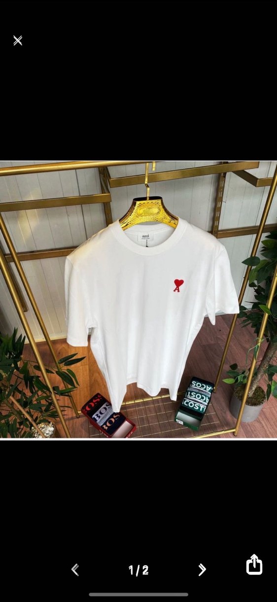 Pamuk kumaştan, kısa kollu ve bisiklet yaka beyaz erkek tişört, göğsünde küçük kırmızı kalp baskısı ile rahat ve şık görünüme sahiptir. Ami Paris s bedeni mevcut