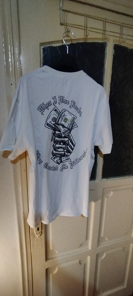 Pamuklu beyaz erkek tişört, loose fit kesim ve sırtında baskılı desen. Bisiklet yaka ve kısa kollu, rock punk tarzına uygun street wear. Normal boyda, gri baskılı detaylar.