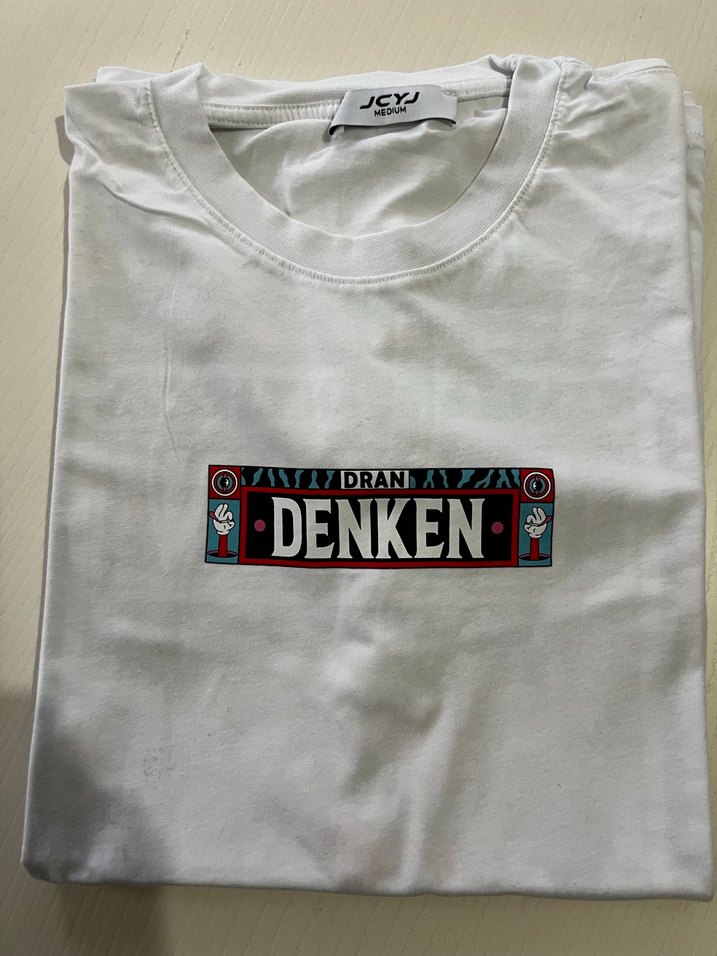 Pamuk beyaz kısa kollu erkek tişörtü, yuvarlak yaka ve 'DENKEN' baskılı. Rahat kesim, normal boy, sokak stiline uygun.