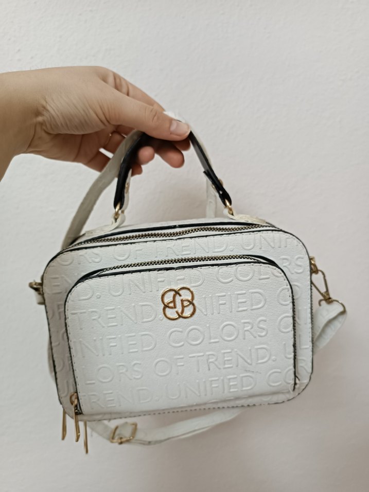 Beyaz deri kadın çanta, kabartmalı yazılı baskı ve fermuarlı kapanışa sahiptir. Trendy Paris tarzını yansıtan küçük sap ve çıkarılabilir askı bulunur.