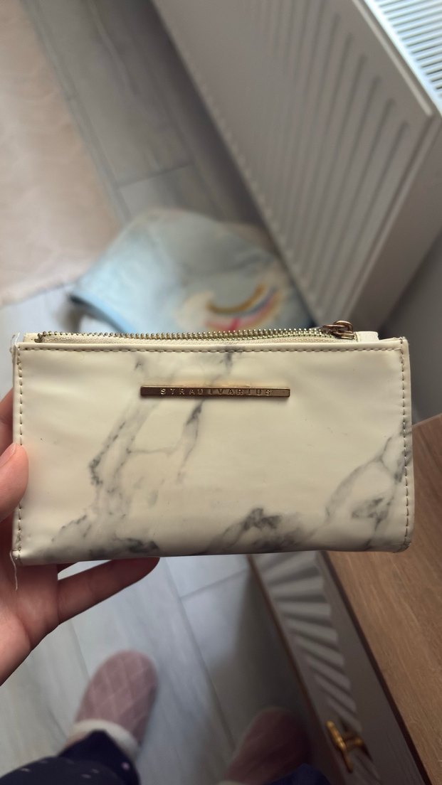 Beyaz baskılı fermuarlı kadın cüzdanı, günlük kullanım için uygun, trend sokak stili ile uyumlu.