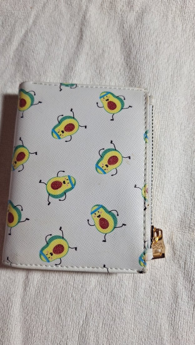 Beyaz renkte, baskılı avokado desenli ve fermuarlı kadın cüzdanı. Sentetik kumaştan üretilmiş, günlük kullanıma uygun bohem ve minimal tarzda.
