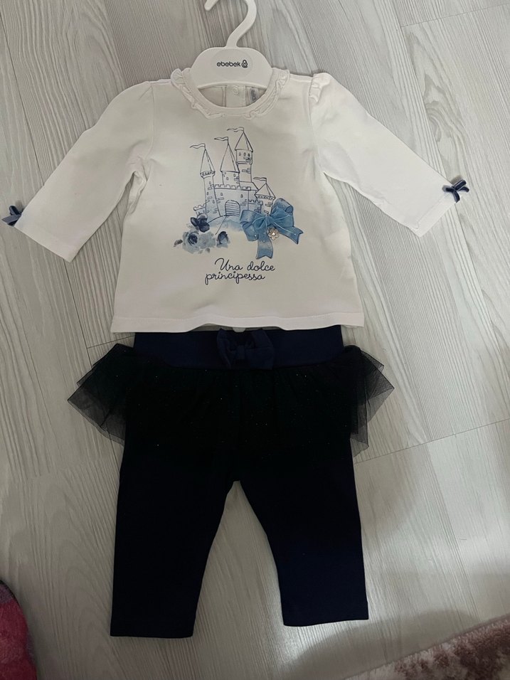Beyaz uzun kollu, kalede baskı ve fırfır detaylı üst ile tül fırfırlı koyu renk tayt takımı. Ürün yurt dışından alındı çok cici bir takım