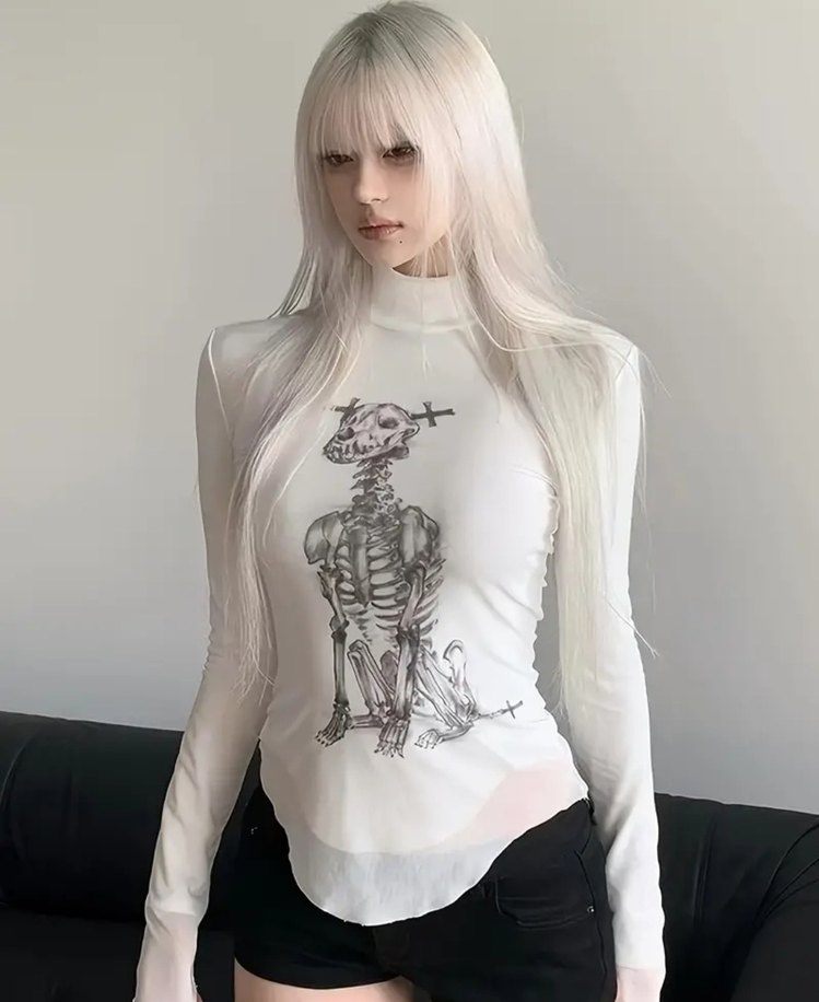 Beyaz, yüksek yakalı ve uzun kollu kadın üst, gri baskılı gotik iskelet deseniyle dikkat çeker. Sadece ön tarafından astarlı arkası tül açık