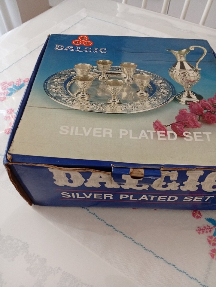 Bu gümüş kaplama servis seti, beyaz zeminde baskılı desenlere sahip tepsi, sürahi ve altı bardaktan oluşmaktadır. Set orijinal mavi kutusunda sunulur. ️