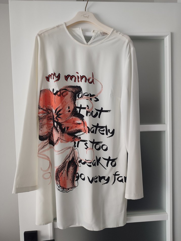 Beyaz, uzun kollu hamile mini elbise, bol kesim ve ipeksi dokuda. Drapeli tasarım ve yazılı çiçek baskısı içerir, günlük rahat kullanım için uygundur.