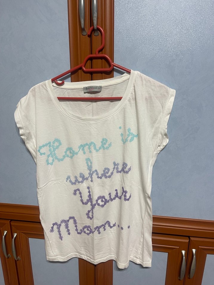 Pamuk kumaştan, kısa kollu, yuvarlak yaka ve bol kesim beyaz hamile tişörtü. Pastel renklerle örülmüş "Home is where Your Mom..." yazısı bulunur. Rahat ev kullanımı için uygundur.