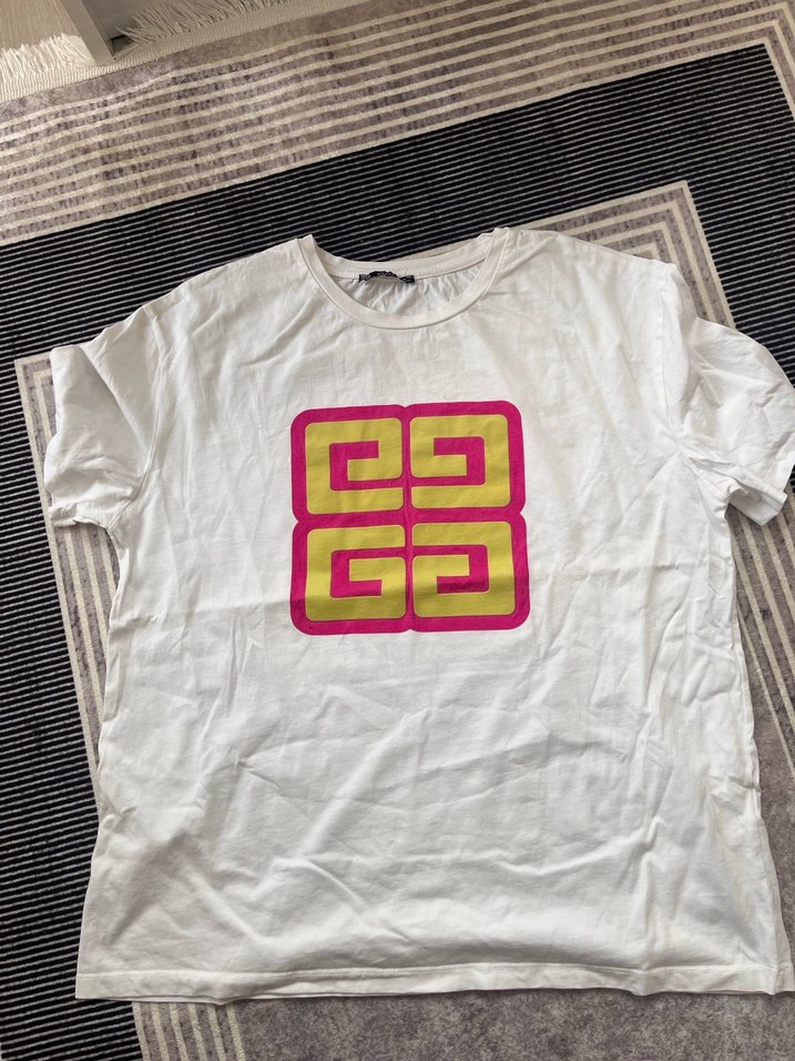 Beyaz, bol kesim kısa kollu hamile tişörtü. Önünde pembe ve sarı baskı bulunur. Yumuşak sentetik kumaştan, günlük rahat kullanım için uygun.