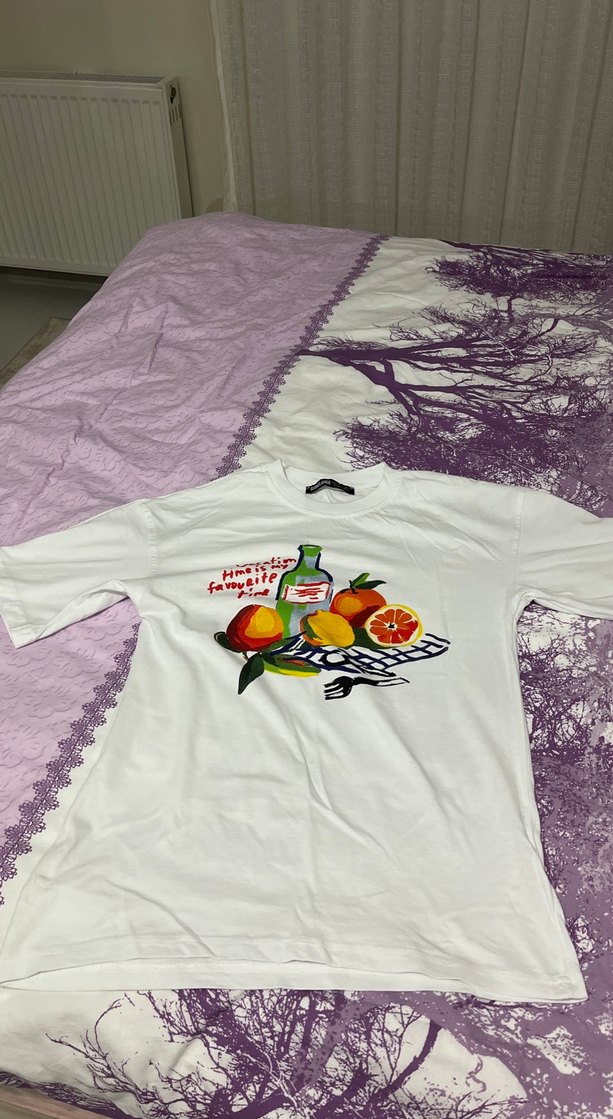 Beyaz pamuk hamile tişörtü, kısa kollu ve bisiklet yaka. Renkli meyve baskısı ve drapeli rahat kesime sahip, günlük kullanıma uygun.