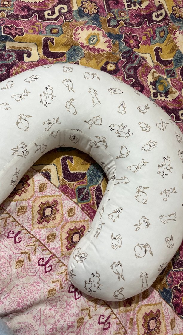 Beyaz zemin üzerine pastel tonlarda baskılı tavşan desenli hamile ve emzirme yastığıdır. Sayılı kullanıldı temiz