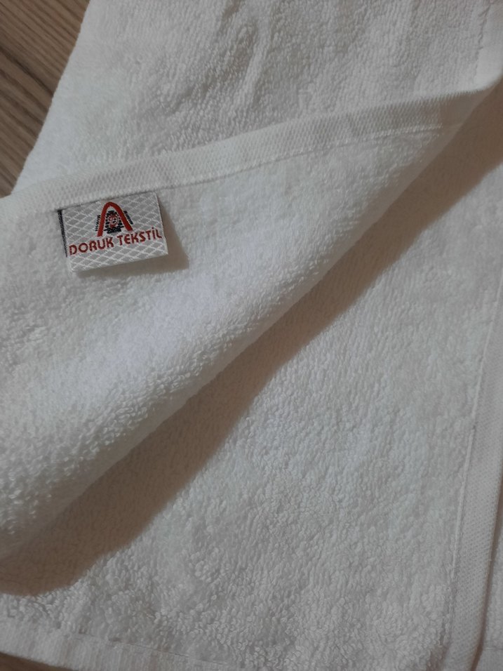 Doruk Tekstil imzalı, parlak baskılı desenli beyaz geleneksel havlu. Yumuşak ve emici kumaş, günlük kullanım için uygundur.70×140