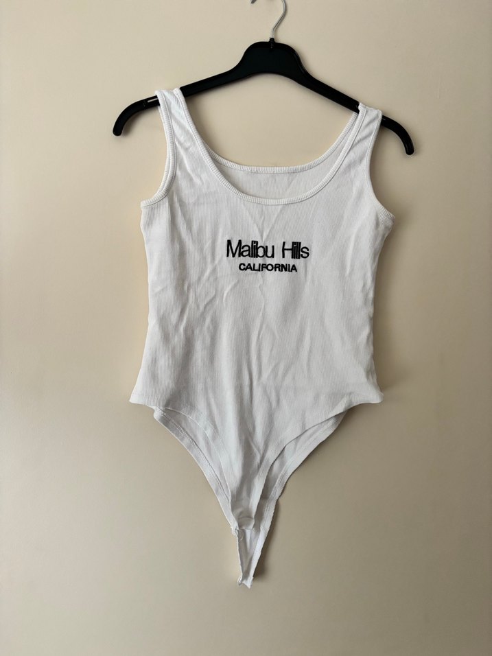 Beyaz, ince askılı, baskılı "Malibu Hils CALIFORNIA" yazılı, normal boy ve, dar kesim çıtçıtlı body. M-L uygun