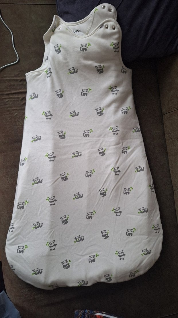 Yumuşak ve sıcak beyaz bebek uyku tulumu, baskılı panda deseniyle. Kadifemsi kumaştan yapılmış, uyku sırasında rahatlık sağlar.