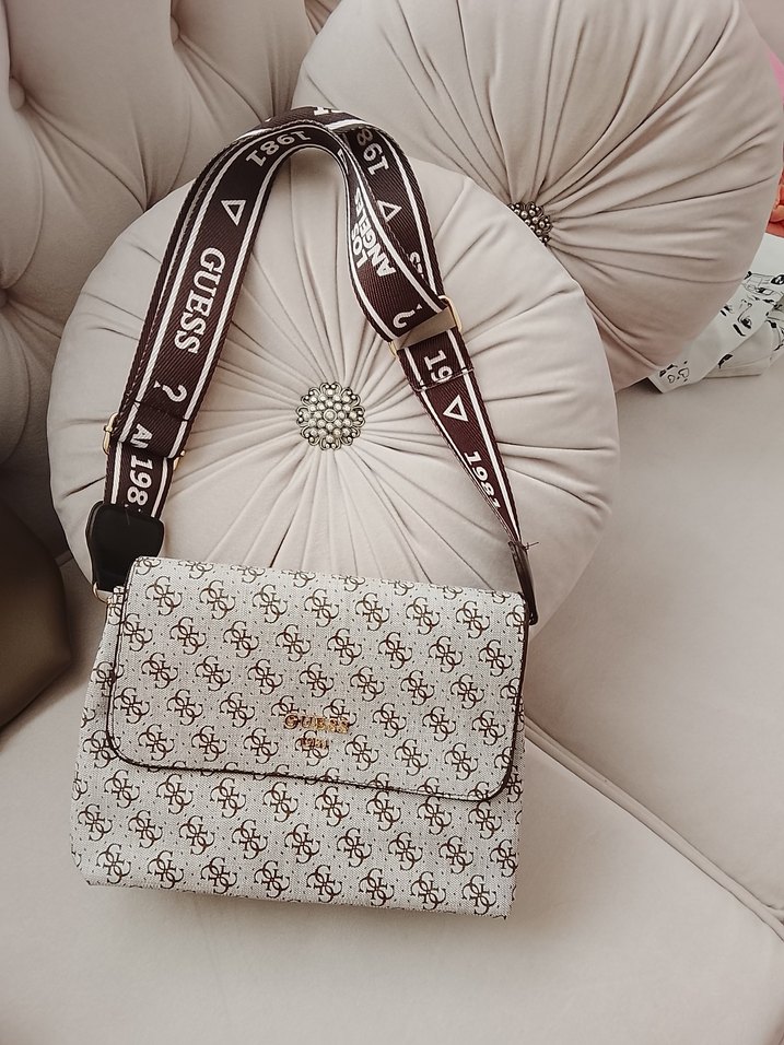 Beyaz baskılı kadın çanta, Guess marka tokalı askıya sahip. Sentetik kumaştan, trend sokak stili için uygun.