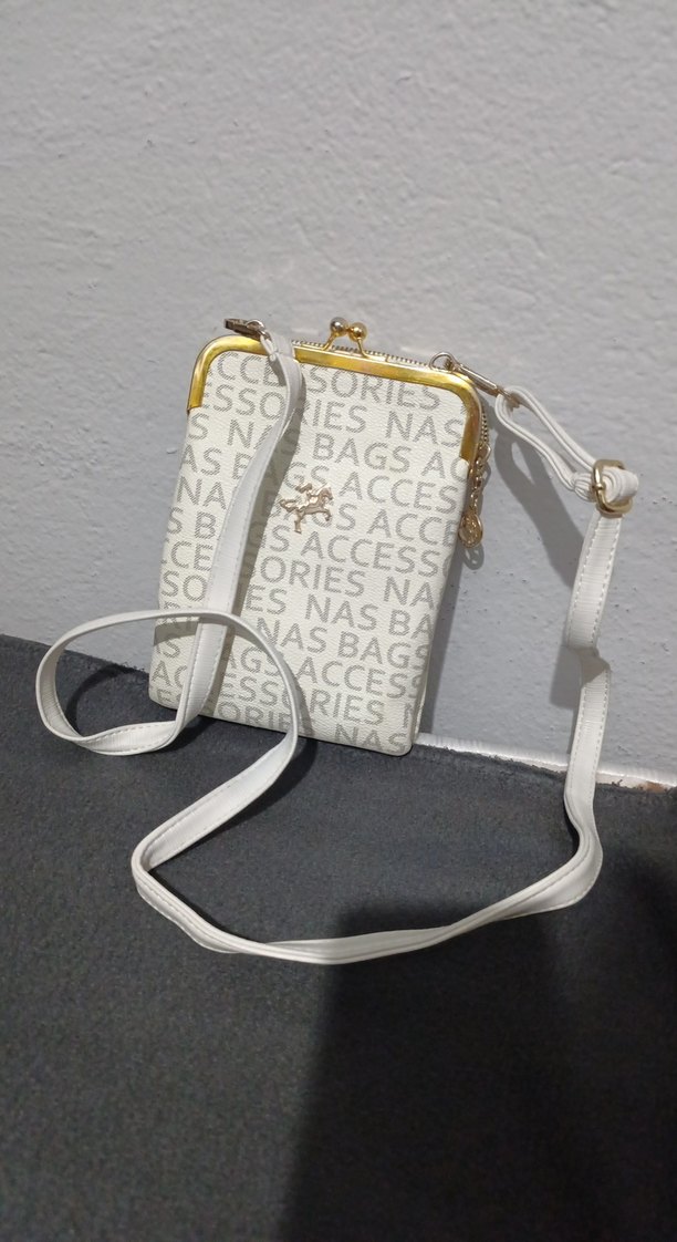 Beyaz baskılı, fermuarlı kapamalı, sokak stili kadın çapraz çanta. Sentetik kumaştan, günlük kullanım için uygundur.