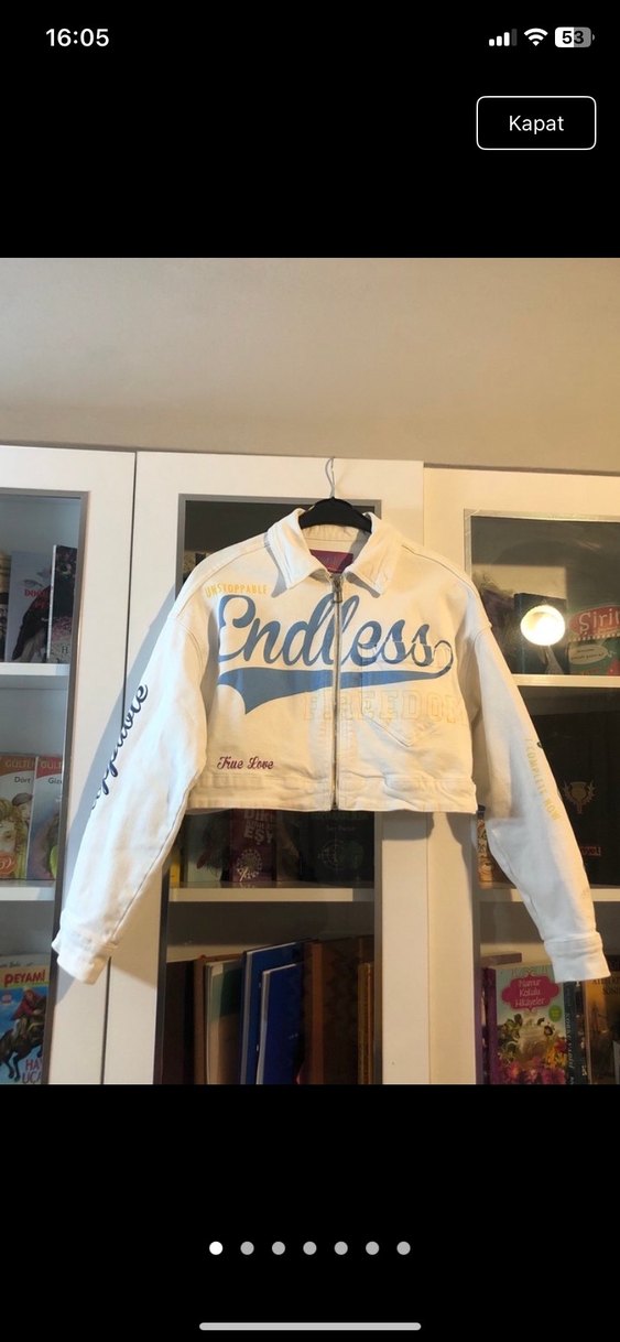 Beyaz denim kumaştan üretilmiş, uzun kollu ve fermuarlı, bol kesim crop ceket. Pastel tonlarda baskılı desenlerle günlük kullanıma uygun.
