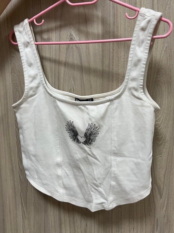 Beyaz, baskılı kanatlı kalp deseniyle süslenmiş, ince ve vücuda oturan askısız crop top. Günlük kullanıma uygun, minimal ve rahat bir tasarım.