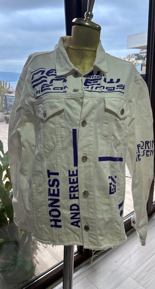 Beyaz Baskılı Kadın Denim Ceket