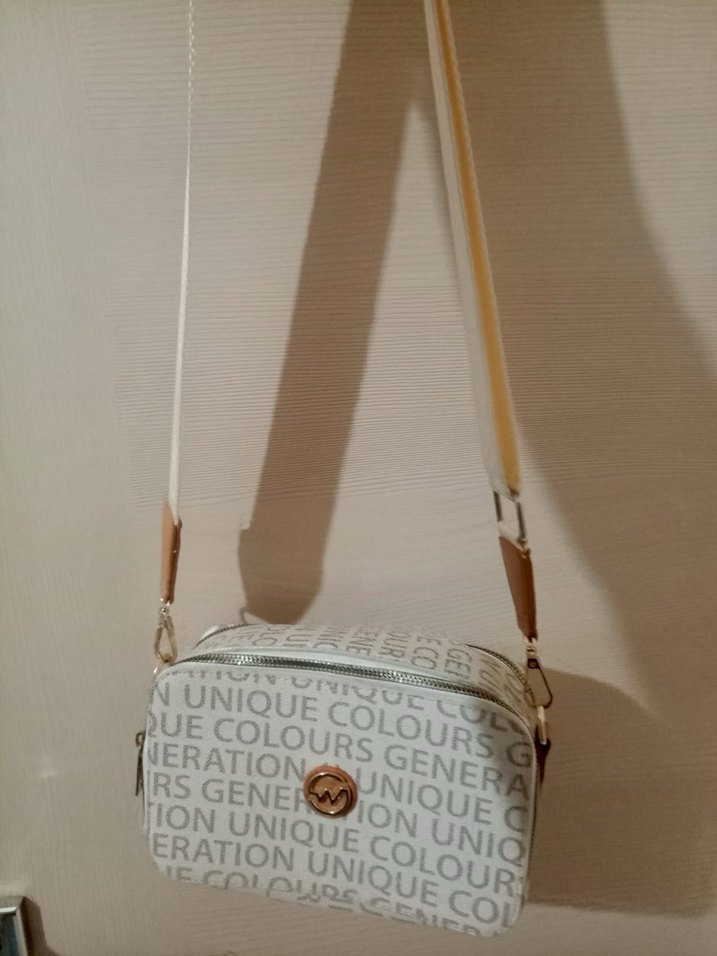 Beyaz renkli, baskılı yazılarla süslenmiş ve tokalı detaylı deri çapraz çanta. Gri askısı ile minimalist ve trend sokak stili sunar.