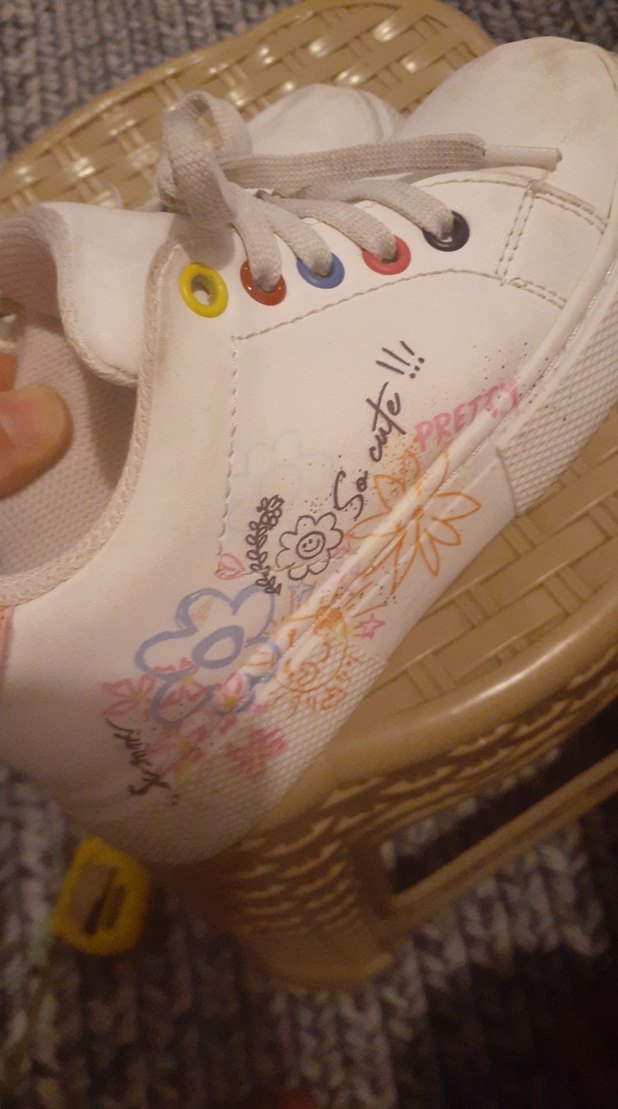 Beyaz renkli, dolgu topuklu kadın spor ayakkabı. Pastel renkli bağcık delikleri ve baskılı çiçek desenleri bulunur. Kauçuk malzemeden yapılmıştır, günlük kullanım için uygundur.