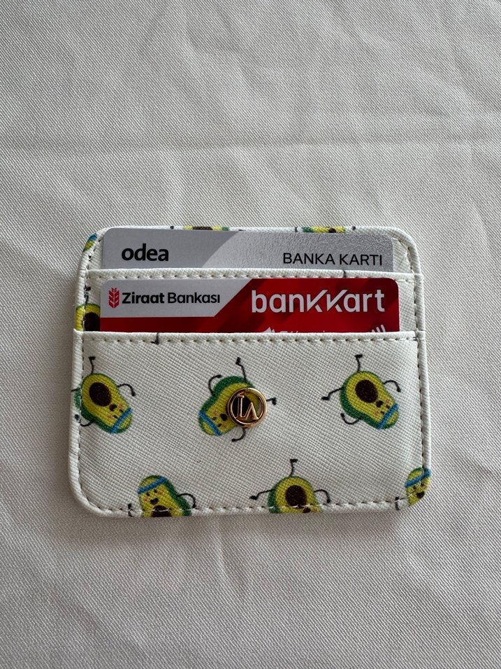 Beyaz sentetik kumaştan, avokado baskılı, tokalı kadın cüzdanı. Kartlık bölmeleri bulunur, günlük kullanım için uygundur.