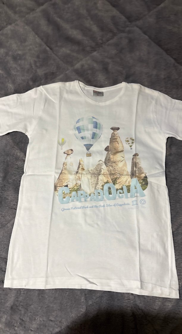 Beyaz pamuk kumaştan, kısa kollu ve yuvarlak yaka kadın tişörtü. Cappadocia temalı pastel baskısı ve rahat kesimiyle dış mekan kullanımı için uygundur.