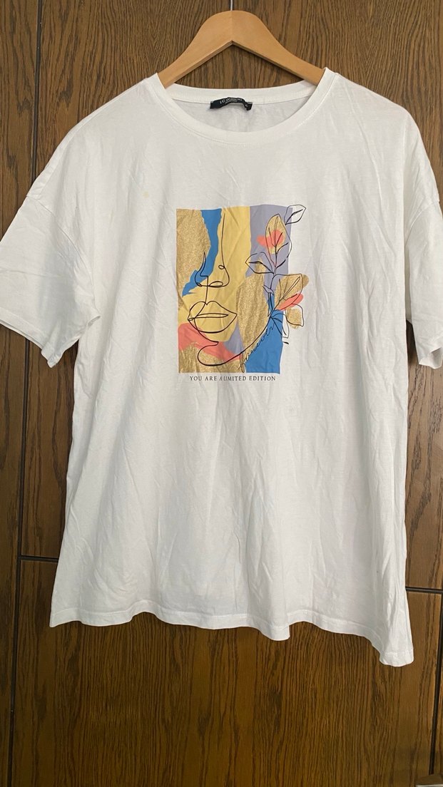 Pamuklu beyaz tişört, kısa kollu, yuvarlak yaka ve bol kesimdir. Önünde pastel tonlarda soyut yüz baskısı bulunur. Günlük kullanım için uygundur. Yıkanması gerekiyor