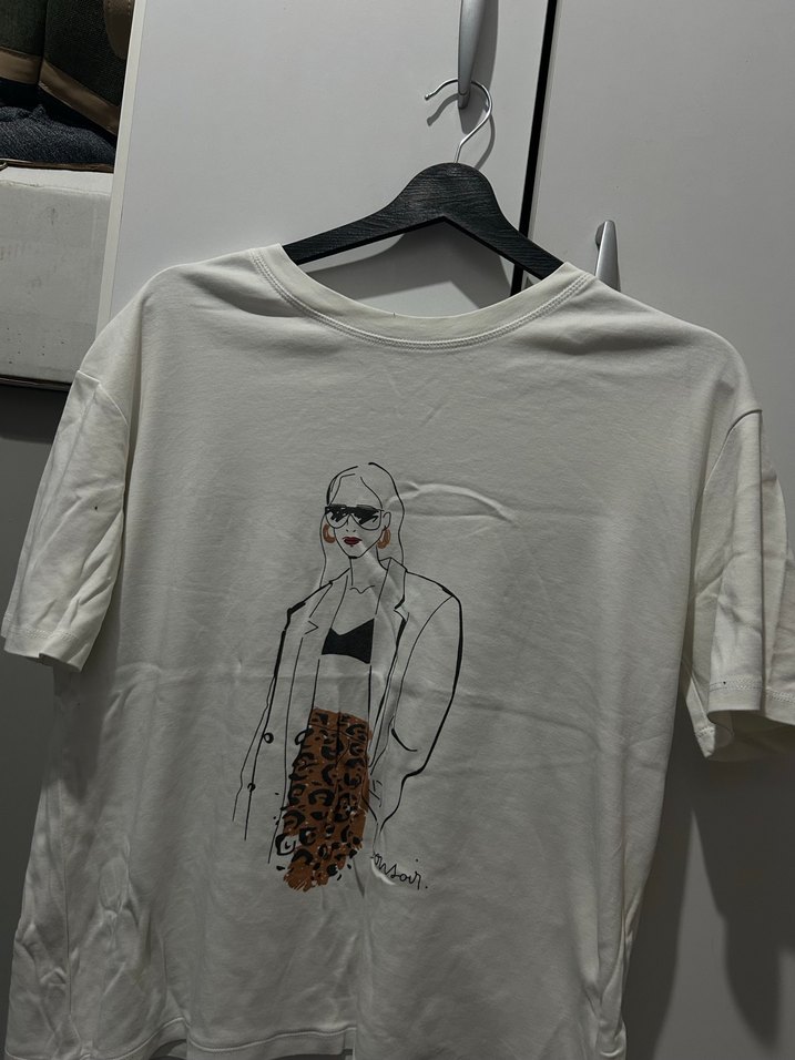 Pamuklu, beyaz, baskılı, bol kesim kısa kollu tişört. Yuvarlak yaka ve rahat kesimiyle gündelik kullanıma uygundur.