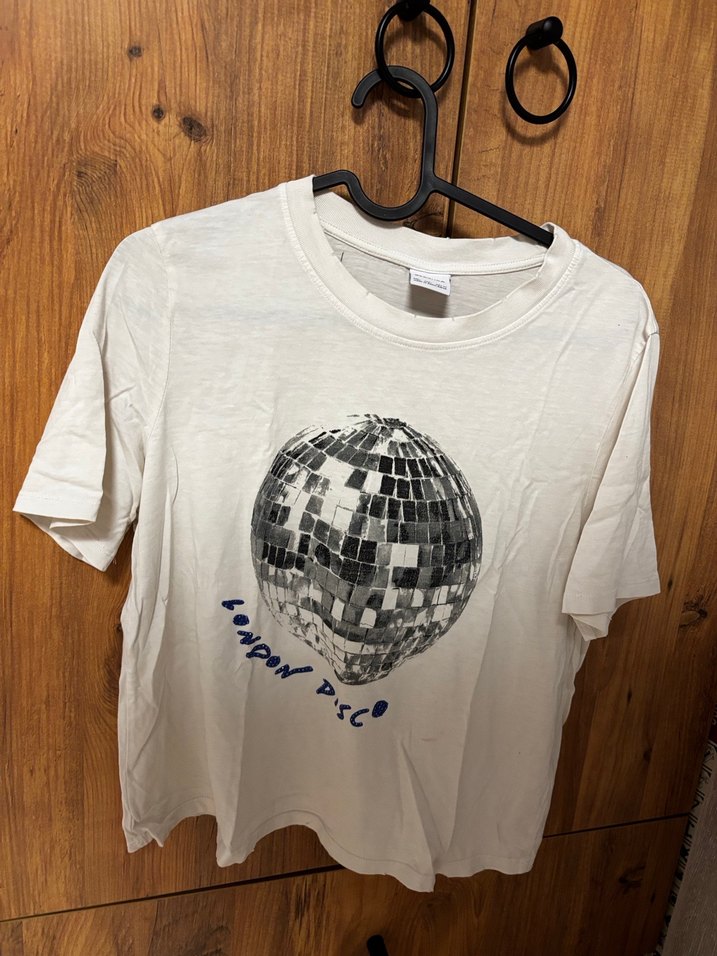 Beyaz pamuklu kadın tişörtü, baskılı disko topu deseni, kısa kollu, yuvarlak yaka ve bol kesimdir, günlük veya parti için uygundur.