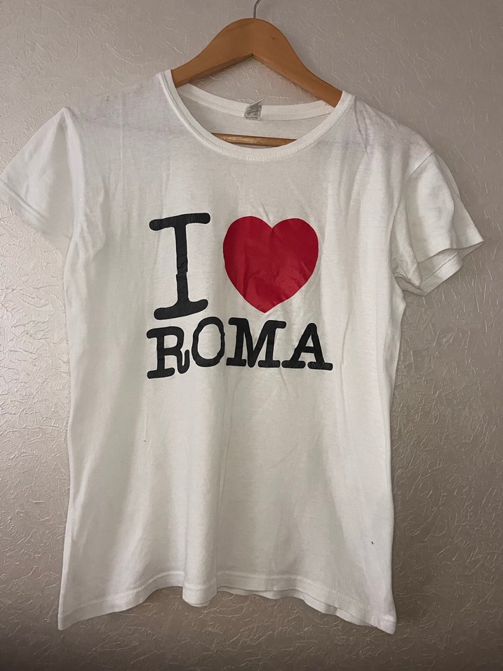 Beyaz , kısa kollu, bisiklet yaka, I ❤️ ROMA baskılı, kadın tişörtü.