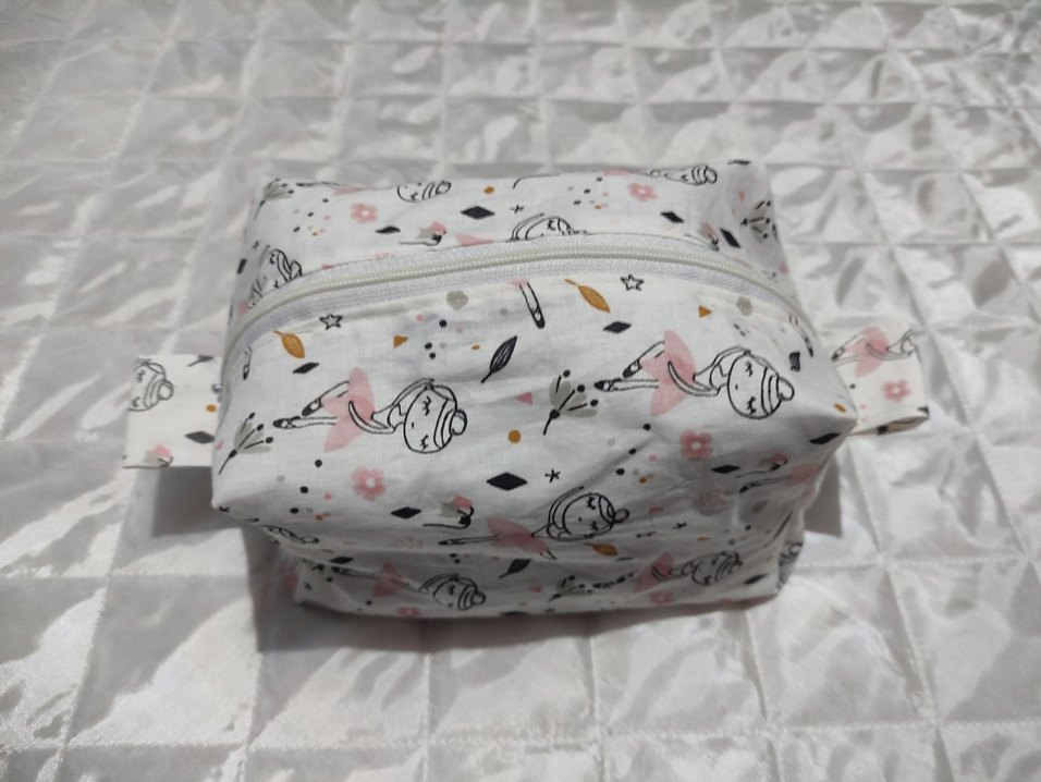 Beyaz renkte, pastel baskılı ve fermuarlı kadın makyaj çantası. Sentetik kumaştan üretilmiş, günlük kullanıma uygun, rahat ve bohem tarzda. bunları kendim yapıyorum isteğe göre yapılır