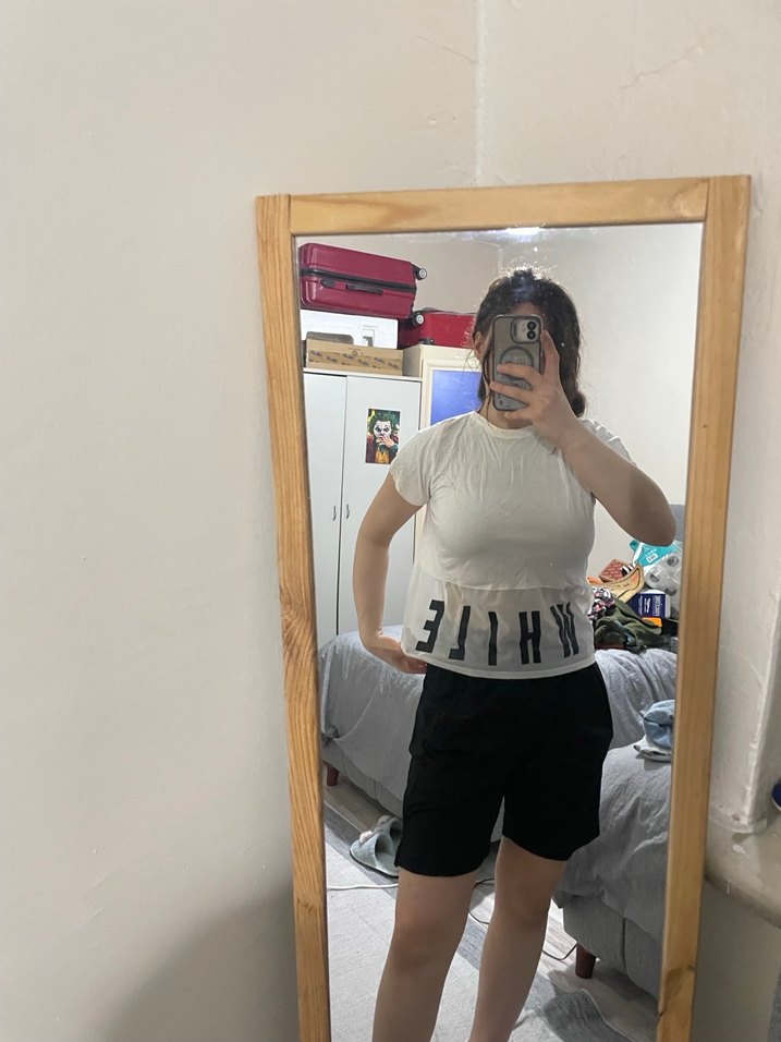 Beyaz baskılı, vücuda oturan midi uzunluğunda kadın tişört, trend sokak stili ve rahat şıklık sunar. Ufak kusurları var görselde mevcuttur.