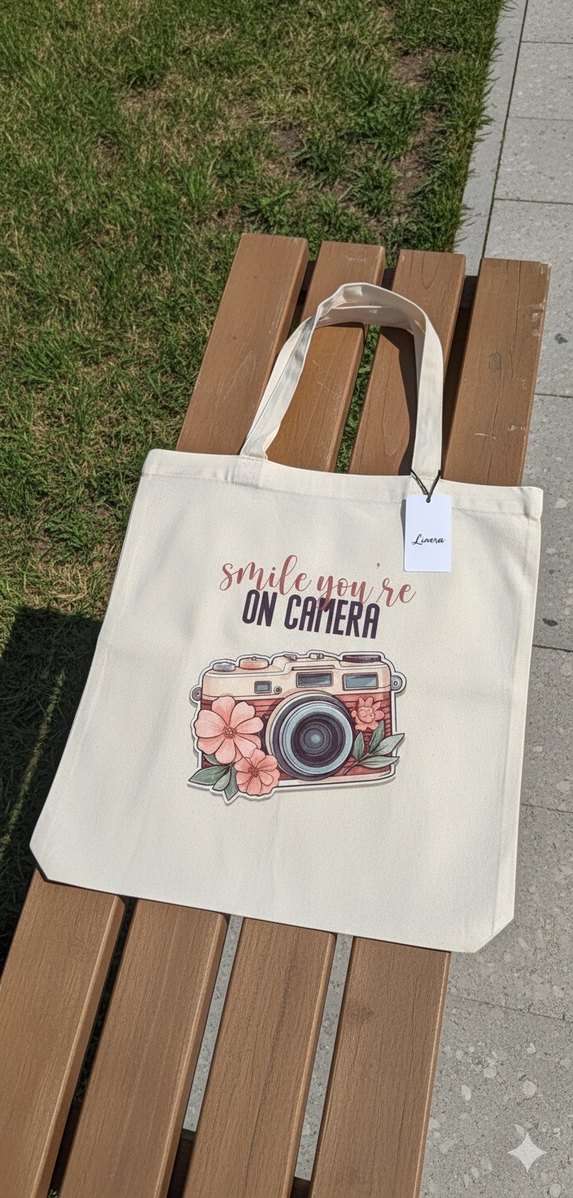 Beyaz kanvas kumaştan, pastel renkli baskılı kamera ve çiçek desenli, 'Smile you're on camera' yazılı kadın omuz çantası. Günlük sokak stili için uygun.