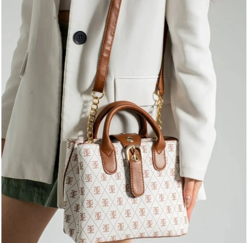 Beyaz baskılı, kahverengi tokalı sapları olan kadın omuz çantası. Sokak stili ve Paris esintisiyle günlük kullanıma uygun.