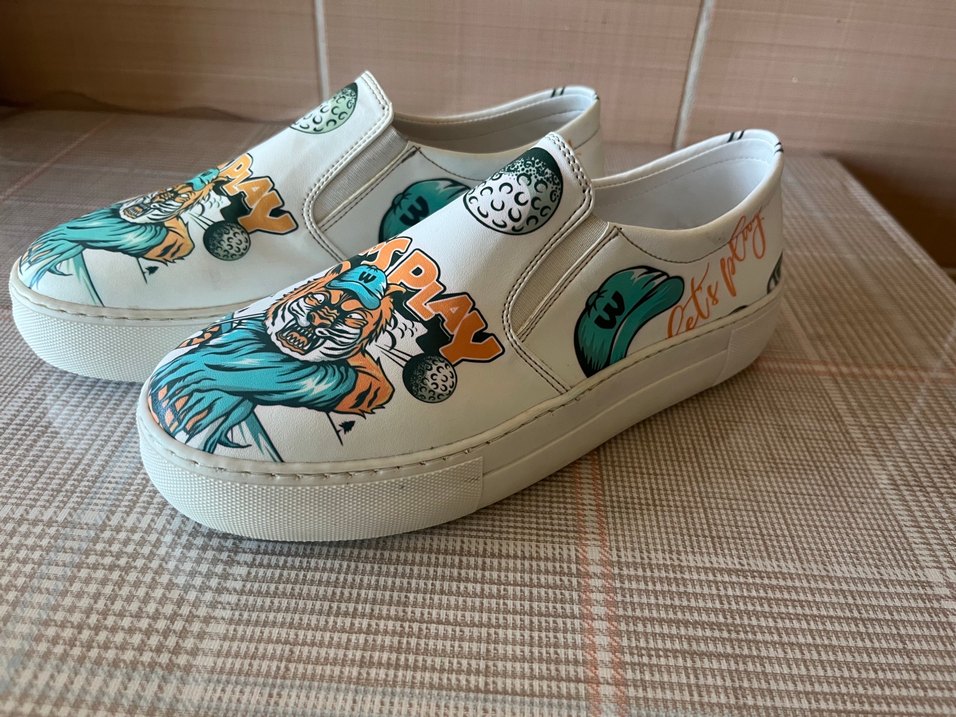 Beyaz renkte, renkli baskılı ve platform tabanlı, kauçuk malzemeden üretilmiş günlük kullanıma uygun kadın spor ayakkabısı. Yeni