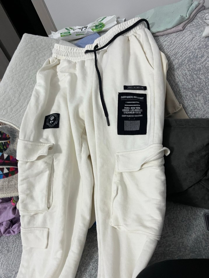 Baskılı detaylar ve cırt cırtlı cepleri olan, rahat kesim beyaz pamuklu kadın spor pantolonu, günlük kullanıma uygundur. ♀️bershka marka