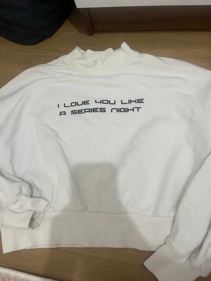 Beyaz, uzun kollu ve bisiklet yaka olan bu sweatshirt, bol kesimdir. Önünde 'I LOVE YOU LIKE A SERIES NIGHT' yazılı baskı vardır. Yumuşak ve sıcak kumaştan üretilmiştir, rahat ve şık bir görünüm sunar. ✨