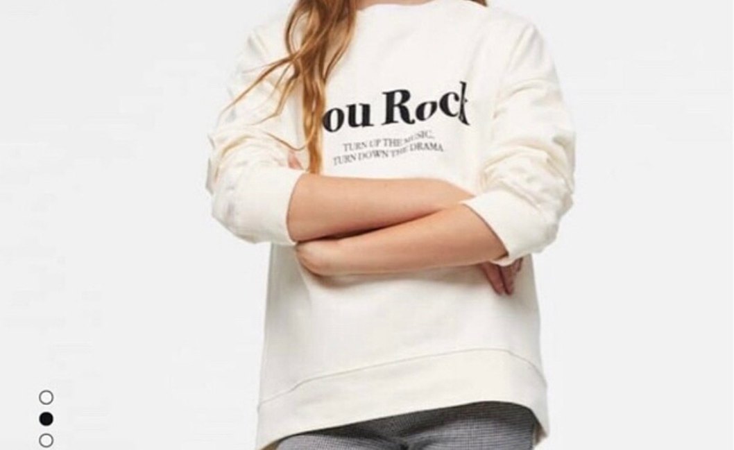 Pamuklu kumaştan, beyaz renkli, baskılı ve uzun kollu, bol kesim kadın sweatshirt. Günlük kullanım için rahat ve şık bir parça.