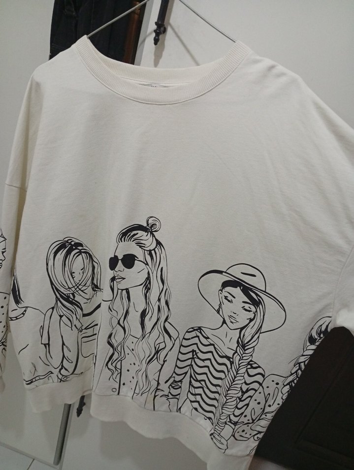 Pamuklu, beyaz, uzun kollu, baskılı kadın sweatshirt. Salaş kesimi ve bisiklet yaka detayıyla günlük rahat kullanıma uygun.