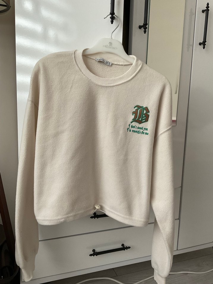 Beyaz renkli, yuvarlak yaka ve uzun kollu kadın sweatshirtü. Yumuşak ve sıcak kumaştan, rahat kesimli ve baskılı tasarımlı, günlük kullanıma uygun.