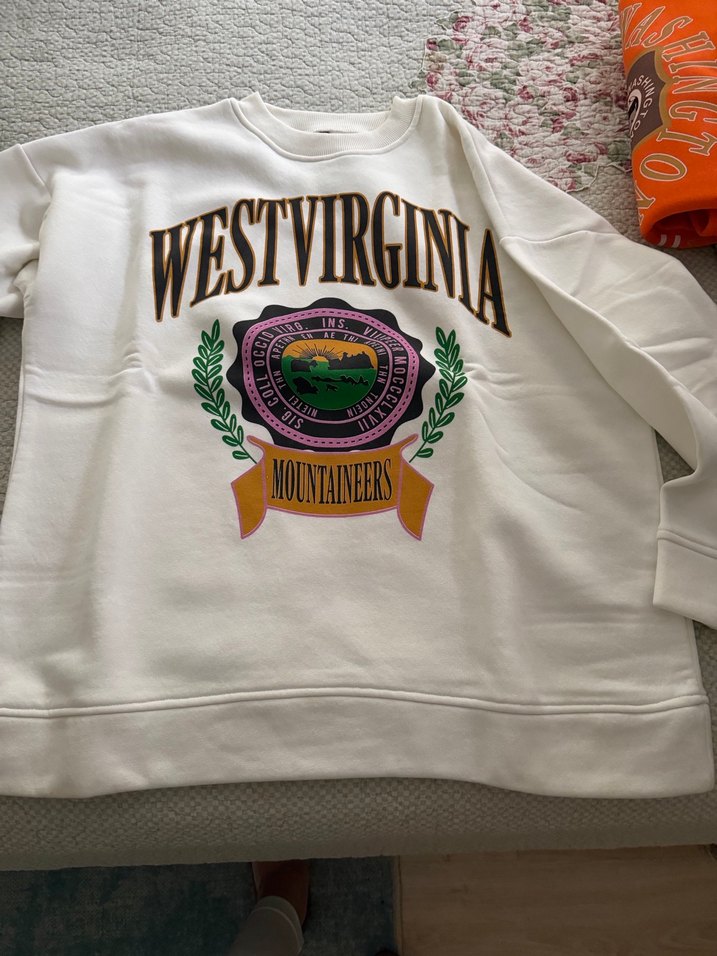 Beyaz, uzun kollu, yuvarlak yaka ve bol kesim kadın sweatshirtü. West Virginia Mountaineers baskılı ve yumuşak, sıcak tutan kumaştan üretilmiştir.