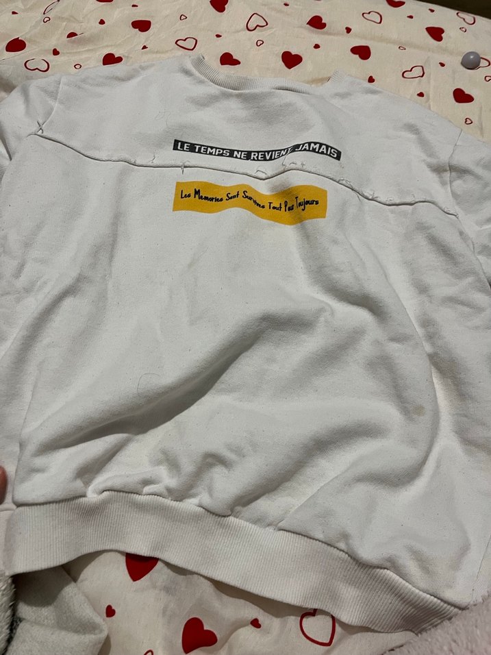 Beyaz renkli, baskılı, yuvarlak yaka ve uzun kollu kadın sweatshirt. Pamuklu yumuşak kumaştan, rahat kesim ve normal midi boyda. Günlük sokak stili için idealdir.
