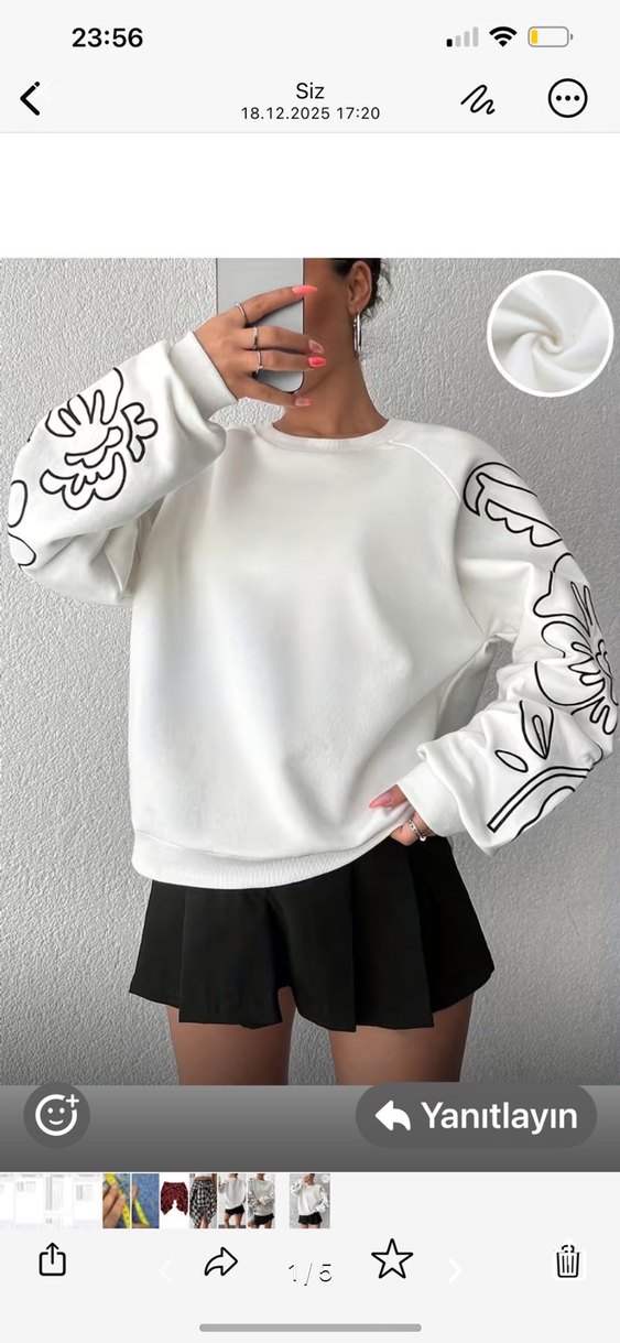Siyah nakış kollara sahip, yuvarlak yakalı ve uzun kollu beyaz bol kesim sweatshirt. Yumuşak ve sıcak kumaştan üretilmiştir.