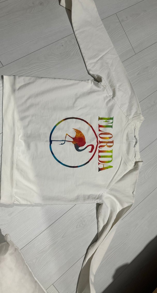 Pamuklu, uzun kollu ve yuvarlak yakalı beyaz sweatshirt, önünde renkli flamingo ve 'FLORIDA' baskısı ile rahat kesim ve günlük dış mekan kullanımı için uygun.