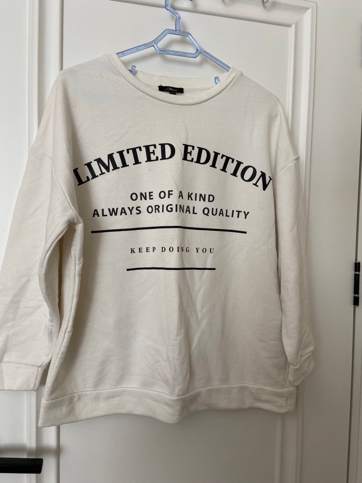 Beyaz pamuklu sweatshirt, uzun kollu ve yuvarlak yaka. Gevşek kesim ve baskılı özgün tasarımla günlük rahat stil sunar. ✨