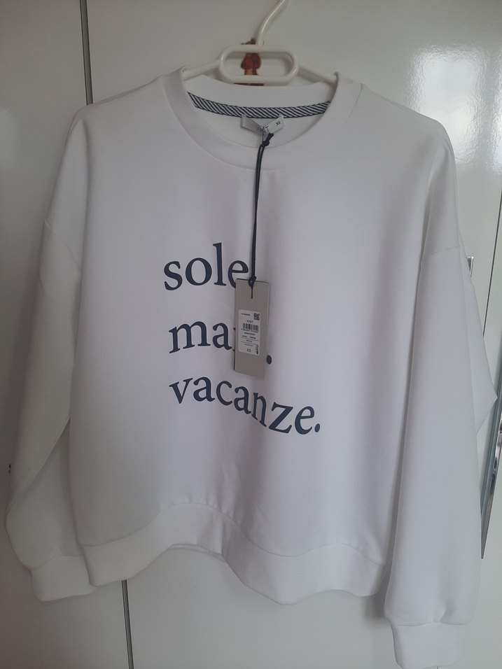 Beyaz, baskılı, uzun kollu, yuvarlak yaka, bol kesim kadın sweatshirt. Yumuşak kumaştan, günlük rahat ve şık sokak stili için uygundur. ☀️