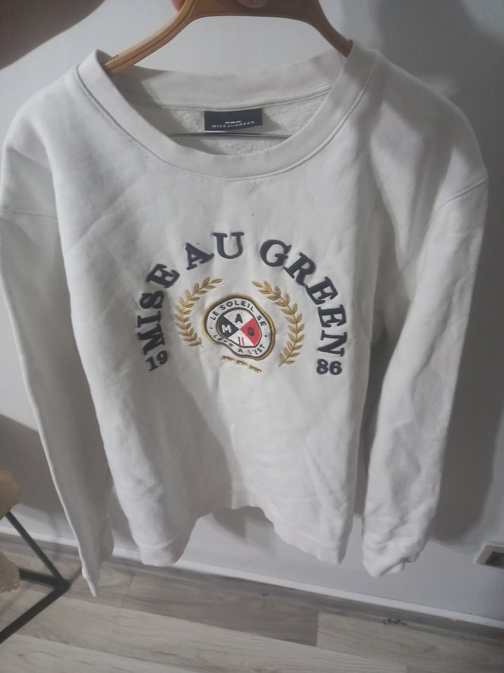 Beyaz pamuklu kumaştan yapılmış, uzun kollu ve yuvarlak yakalı rahat kesim kadın sweatshirt. "AU" baskılı deseniyle günlük ve şık bir görünüm sunar.