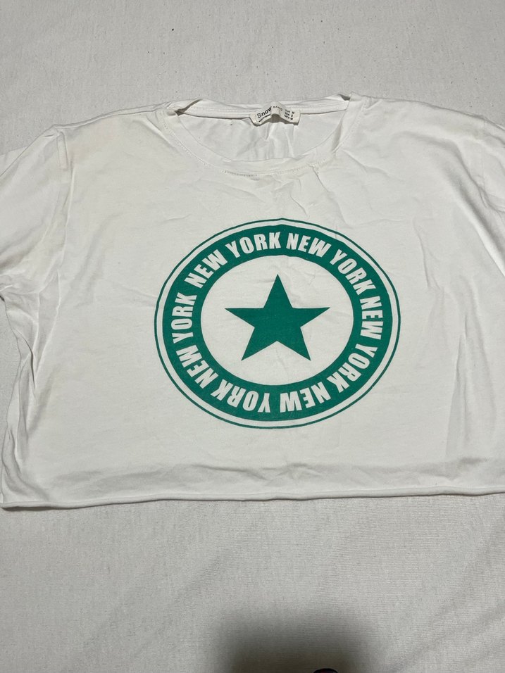 Beyaz pamuklu, kısa kollu ve yuvarlak yakalı kadın tişörtü. Yeşil yıldız ve New York baskılı, bol kesim rahat spor tarz tişört. ⭐