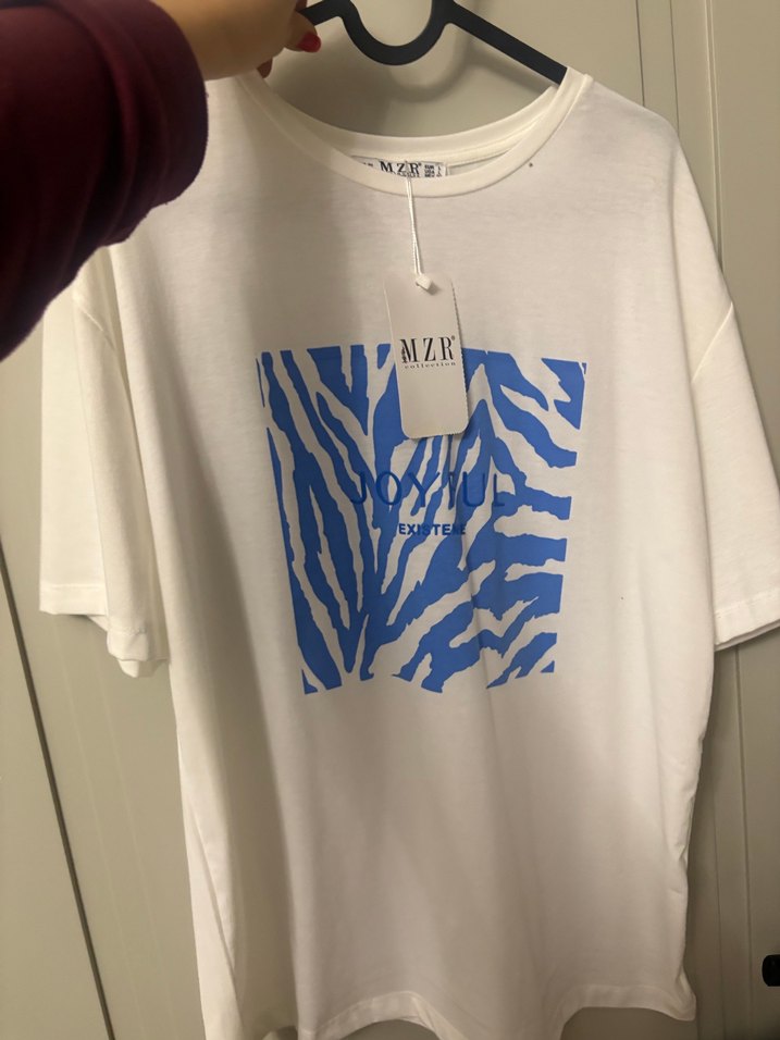 Beyaz pamuklu kumaştan, önünde mavi baskılı deseni olan, kısa kollu, yuvarlak yakalı ve bol kesim kadın tişörtü. Rahat ve gündelik tarz için uygundur.