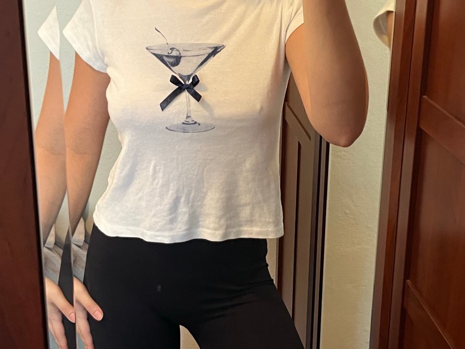 kısa kollu, baskılı kokteyl bardaklı ve fiyonk detaylı beyaz kadın tişörtü. Parti için uygun, şık ve rahat.